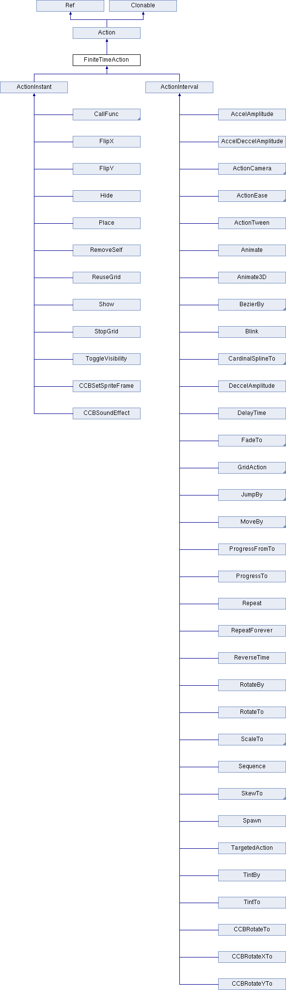 Implemented in TargetedAction, Animate, ReverseTime, DelayTime, EaseCubicActionInOut, TintBy, EaseCubicActionOut, EaseCubicActionIn, TintTo, EaseCircleActionInOut, FadeOut, EaseCircleActionOut, FadeIn, EaseCircleActionIn, EaseQuinticActionInOut, FadeTo, EaseQuinticActionOut, Blink, EaseQuinticActionIn, ScaleBy, EaseQuarticActionInOut, EaseQuarticActionOut, EaseQuarticActionIn, ScaleTo, EaseQuadraticActionInOut, BezierTo, EaseQuadraticActionOut, EaseQuadraticActionIn, BezierBy, EaseBezierAction, JumpTo, EaseBackInOut, EaseBackOut, JumpBy, EaseBackIn, SkewBy, EaseBounceInOut, SkewTo, EaseBounceOut, MoveTo, EaseBounceIn, __CCCallFuncO, EaseBounce, MoveBy, EaseElasticInOut, __CCCallFuncND, EaseElasticOut, RotateBy, CallFuncN, SplitCols, EaseElasticIn, RotateTo, SplitRows, EaseElastic, Twirl, JumpTiles3D, Spawn, CallFunc, EaseSineInOut, ReuseGrid, EaseSineOut, Waves, StopGrid, CatmullRomBy, WavesTiles3D, CCBEaseInstant, CCBRotateYTo, EaseSineIn, CatmullRomTo, DeccelAmplitude, Liquid, Place, RepeatForever, CCBRotateXTo, TurnOffTiles, EaseExponentialInOut, CardinalSplineBy, CCBRotateTo, AccelAmplitude, Shaky3D, FlipY, FadeOutDownTiles, EaseExponentialOut, CCBSoundEffect, FadeOutUpTiles, EaseExponentialIn, CardinalSplineTo, Repeat, Ripple3D, CCBSetSpriteFrame, AccelDeccelAmplitude, FlipX, FadeOutBLTiles, EaseInOut, TiledGrid3DAction, RemoveSelf, FadeOutTRTiles, EaseOut, Lens3D, Sequence, ToggleVisibility, EaseIn, Grid3DAction, FlipY3D, ShuffleTiles, OrbitCamera, Hide, EaseRateAction, FlipX3D, ProgressFromTo, ActionInterval, ActionTween, LuaCallFunc, Show, ShatteredTiles3D, Animate3D, ActionCamera, Waves3D, ActionInstant, PageTurn3D, ActionEase, GridAction, ProgressTo, and ShakyTiles3D.