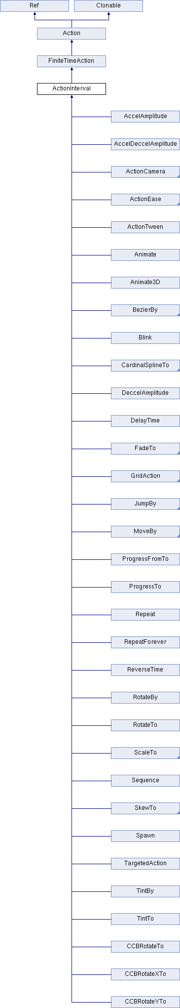 Implemented in TargetedAction, Animate, ReverseTime, DelayTime, EaseCubicActionInOut, TintBy, EaseCubicActionOut, EaseCubicActionIn, TintTo, EaseCircleActionInOut, FadeOut, EaseCircleActionOut, FadeIn, EaseCircleActionIn, EaseQuinticActionInOut, FadeTo, EaseQuinticActionOut, Blink, EaseQuinticActionIn, ScaleBy, EaseQuarticActionInOut, EaseQuarticActionOut, EaseQuarticActionIn, ScaleTo, EaseQuadraticActionInOut, BezierTo, EaseQuadraticActionOut, EaseQuadraticActionIn, BezierBy, EaseBezierAction, JumpTo, EaseBackInOut, EaseBackOut, JumpBy, EaseBackIn, SkewBy, EaseBounceInOut, SkewTo, EaseBounceOut, EaseBounceIn, EaseBounce, MoveBy, EaseElasticInOut, EaseElasticOut, RotateBy, EaseElasticIn, RotateTo, EaseElastic, Spawn, EaseSineInOut, EaseSineOut, CatmullRomBy, CCBEaseInstant, CCBRotateYTo, EaseSineIn, CatmullRomTo, DeccelAmplitude, RepeatForever, CCBRotateXTo, EaseExponentialInOut, CardinalSplineBy, CCBRotateTo, AccelAmplitude, EaseExponentialOut, EaseExponentialIn, CardinalSplineTo, Repeat, AccelDeccelAmplitude, EaseInOut, EaseOut, Sequence, EaseIn, EaseRateAction, ProgressFromTo, ActionTween, Animate3D, ActionCamera, ActionEase, GridAction, and ProgressTo.