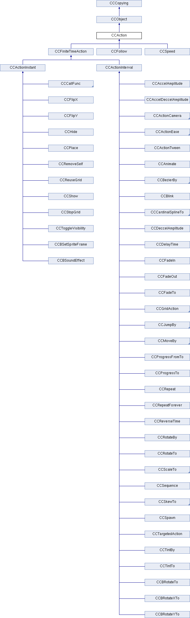 Reimplemented in CCTargetedAction, CCAnimate, CCReverseTime, CCDelayTime, CCTintBy, CCTintTo, CCFadeTo, CCFadeOut, CCFadeIn, CCBlink, CCScaleTo, CCBezierBy, CCEaseBackInOut, CCEaseBackOut, CCJumpBy, CCEaseBackIn, CCEaseBounceInOut, CCSkewTo, CCEaseBounceOut, CCEaseBounceIn, CCMoveBy, CCEaseElasticInOut, CCRotateBy, CCEaseElasticOut, CCEaseCubicActionInOut, CCRotateTo, CCEaseElasticIn, CCCallFunc, CCEaseCubicActionOut, CCSplitCols, CCEaseCubicActionIn, CCSpawn, CCSplitRows, CCEaseCircleActionInOut, CCEaseSineInOut, CCTwirl, CCPlace, CCEaseCircleActionOut, CCJumpTiles3D, CCEaseSineOut, CCEaseCircleActionIn, CCFlipY, CCBEaseInstant, CCEaseSineIn, CCWaves, CCWavesTiles3D, CCBRotateYTo, CCEaseQuinticActionInOut, CCEaseExponentialInOut, CCBRotateXTo, CCLiquid, CCFlipX, CCEaseQuinticActionOut, CCEaseExponentialOut, CCTurnOffTiles, CCBRotateTo, CCDeccelAmplitude, CCEaseQuinticActionIn, CCShaky3D, CCEaseExponentialIn, CCBSoundEffect, CCRepeat, CCRemoveSelf, CCEaseQuarticActionInOut, CCAccelAmplitude, CCRipple3D, CCEaseInOut, CCBSetSpriteFrame, CCCardinalSplineTo, CCToggleVisibility, CCEaseQuarticActionOut, CCEaseOut, CCAccelDeccelAmplitude, CCFadeOutTRTiles, CCSequence, CCEaseQuarticActionIn, CCOrbitCamera, CCLens3D, CCHide, CCEaseIn, CCEaseQuadraticActionInOut, CCShuffleTiles, CCFlipY3D, CCEaseQuadraticActionOut, CCShow, CCFlipX3D, CCProgressFromTo, CCActionTween, CCShatteredTiles3D, CCEaseQuadraticActionIn, CCActionInstant, CCActionEase, CCWaves3D, CCProgressTo, CCPageTurn3D, CCShakyTiles3D, and CCEaseBezierAction.