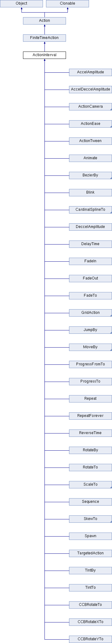 Implemented in TargetedAction, Animate, ReverseTime, DelayTime, TintBy, TintTo, FadeTo, FadeOut, FadeIn, Blink, ScaleBy, ScaleTo, BezierTo, BezierBy, JumpTo, JumpBy, EaseBackInOut, SkewBy, EaseBackOut, EaseBackIn, SkewTo, EaseBounceInOut, MoveTo, EaseBounceOut, MoveBy, EaseBounceIn, EaseBounce, RotateBy, EaseElasticInOut, EaseElasticOut, RotateTo, SplitCols, EaseElasticIn, CatmullRomBy, SplitRows, Spawn, EaseElastic, Twirl, CCBEaseInstant, JumpTiles3D, CatmullRomTo, CCBRotateYTo, EaseSineInOut, DeccelAmplitude, Waves, EaseSineOut, RepeatForever, CCBRotateXTo, WavesTiles3D, CardinalSplineBy, EaseSineIn, AccelAmplitude, CCBRotateTo, Liquid, EaseExponentialInOut, TurnOffTiles, CardinalSplineTo, EaseExponentialOut, Shaky3D, FadeOutDownTiles, Repeat, AccelDeccelAmplitude, EaseExponentialIn, Ripple3D, FadeOutUpTiles, EaseInOut, TiledGrid3DAction, FadeOutBLTiles, EaseOut, FadeOutTRTiles, OrbitCamera, Sequence, Lens3D, EaseIn, Grid3DAction, ShuffleTiles, EaseRateAction, FlipY3D, FlipX3D, ActionTween, ProgressFromTo, ActionCamera, ShatteredTiles3D, ActionEase, Waves3D, PageTurn3D, ProgressTo, GridAction, and ShakyTiles3D.