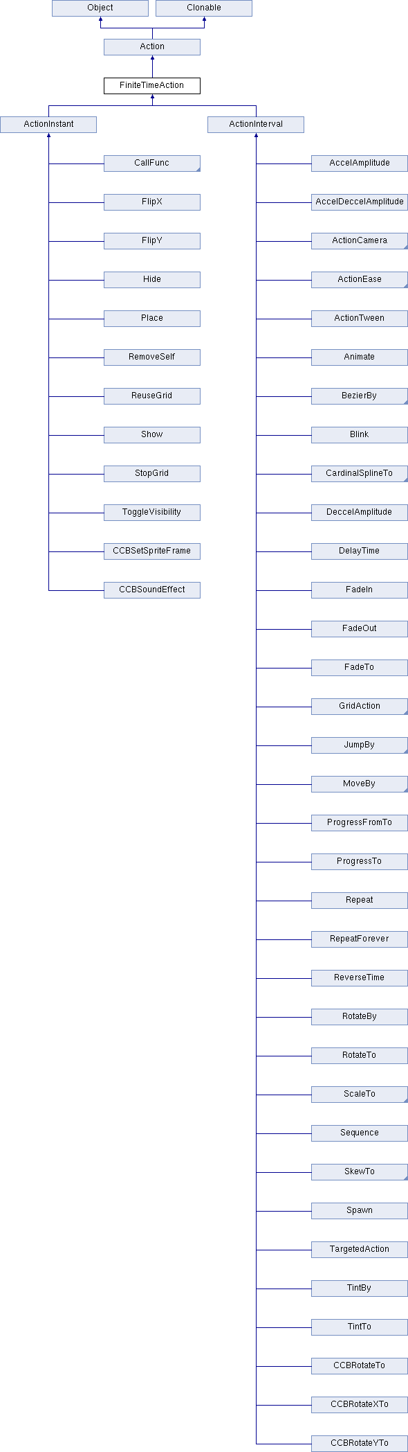 Implemented in TargetedAction, Animate, ReverseTime, DelayTime, TintBy, TintTo, FadeTo, FadeOut, FadeIn, Blink, ScaleBy, ScaleTo, BezierTo, EaseBackInOut, EaseBackOut, BezierBy, EaseBackIn, JumpTo, EaseBounceInOut, JumpBy, EaseBounceOut, SkewBy, EaseBounceIn, EaseBounce, SkewTo, EaseElasticInOut, EaseElasticOut, EaseCubicActionInOut, MoveBy, EaseCubicActionOut, EaseElasticIn, EaseCubicActionIn, RotateBy, EaseElastic, EaseCircleActionInOut, EaseSineInOut, EaseCircleActionOut, RotateTo, ReuseGrid, CallFunc, EaseSineOut, EaseCircleActionIn, CatmullRomBy, CCBEaseInstant, StopGrid, Spawn, EaseSineIn, CCBRotateYTo, EaseQuinticActionInOut, CatmullRomTo, DeccelAmplitude, CCBRotateXTo, EaseExponentialInOut, Place, EaseQuinticActionOut, CardinalSplineBy, CCBRotateTo, RepeatForever, AccelAmplitude, EaseExponentialOut, EaseQuinticActionIn, FlipY, CCBSoundEffect, EaseExponentialIn, EaseQuarticActionInOut, CardinalSplineTo, AccelDeccelAmplitude, CCBSetSpriteFrame, FlipX, EaseQuarticActionOut, EaseInOut, Repeat, RemoveSelf, EaseQuarticActionIn, EaseOut, ToggleVisibility, EaseQuadraticActionInOut, EaseIn, Sequence, Hide, EaseQuadraticActionOut, EaseRateAction, ProgressFromTo, ActionTween, ActionInterval, Show, EaseQuadraticActionIn, ActionCamera, ActionEase, ActionInstant, GridAction, ProgressTo, and EaseBezierAction.