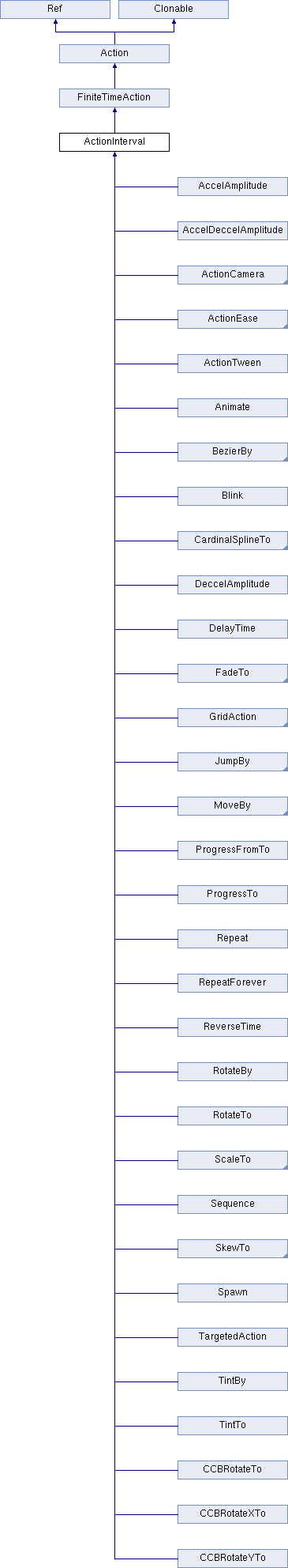 Implemented in TargetedAction, Animate, ReverseTime, DelayTime, EaseCubicActionInOut, EaseCubicActionOut, TintBy, EaseCubicActionIn, TintTo, EaseCircleActionInOut, FadeOut, EaseCircleActionOut, FadeIn, EaseCircleActionIn, EaseQuinticActionInOut, FadeTo, EaseQuinticActionOut, EaseQuinticActionIn, Blink, EaseQuarticActionInOut, ScaleBy, EaseQuarticActionOut, EaseQuarticActionIn, ScaleTo, EaseQuadraticActionInOut, BezierTo, EaseQuadraticActionOut, EaseQuadraticActionIn, BezierBy, EaseBezierAction, JumpTo, EaseBackInOut, EaseBackOut, JumpBy, EaseBackIn, SkewBy, EaseBounceInOut, SkewTo, EaseBounceOut, EaseBounceIn, EaseBounce, MoveBy, EaseElasticInOut, EaseElasticOut, RotateBy, EaseElasticIn, RotateTo, EaseElastic, Spawn, EaseSineInOut, EaseSineOut, CatmullRomBy, CCBEaseInstant, CCBRotateYTo, EaseSineIn, CatmullRomTo, DeccelAmplitude, RepeatForever, CCBRotateXTo, EaseExponentialInOut, CardinalSplineBy, CCBRotateTo, AccelAmplitude, EaseExponentialOut, EaseExponentialIn, CardinalSplineTo, Repeat, AccelDeccelAmplitude, EaseInOut, EaseOut, Sequence, EaseIn, EaseRateAction, ProgressFromTo, ActionTween, ActionCamera, ActionEase, GridAction, and ProgressTo.